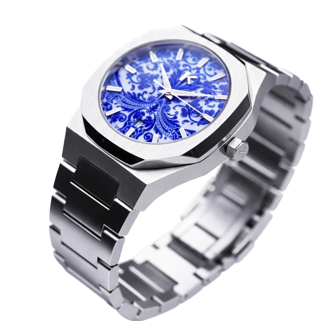 Notre premier modèle, Aoi-Ki Bleu Impérial inaugure notre univers horloger, avec un design blanc et bleu inspiré des porcelaines chinoises.